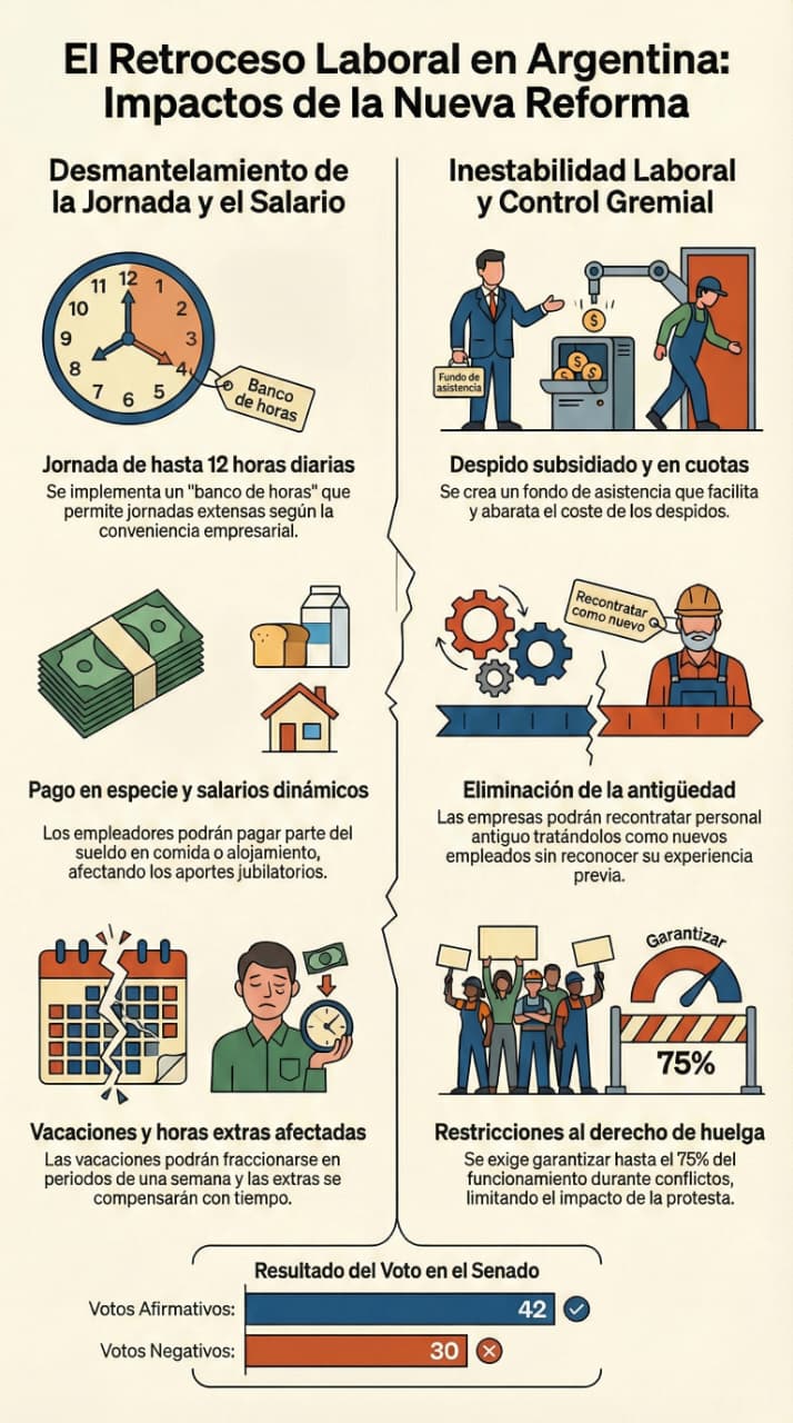 La reforma impulsada por el gobierno de Milei (aprobada en el Senado el 12 de febrero de 2026) se centra en reducir costos empresariales, pero a costa de la estabilidad del empleado.